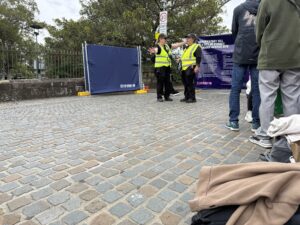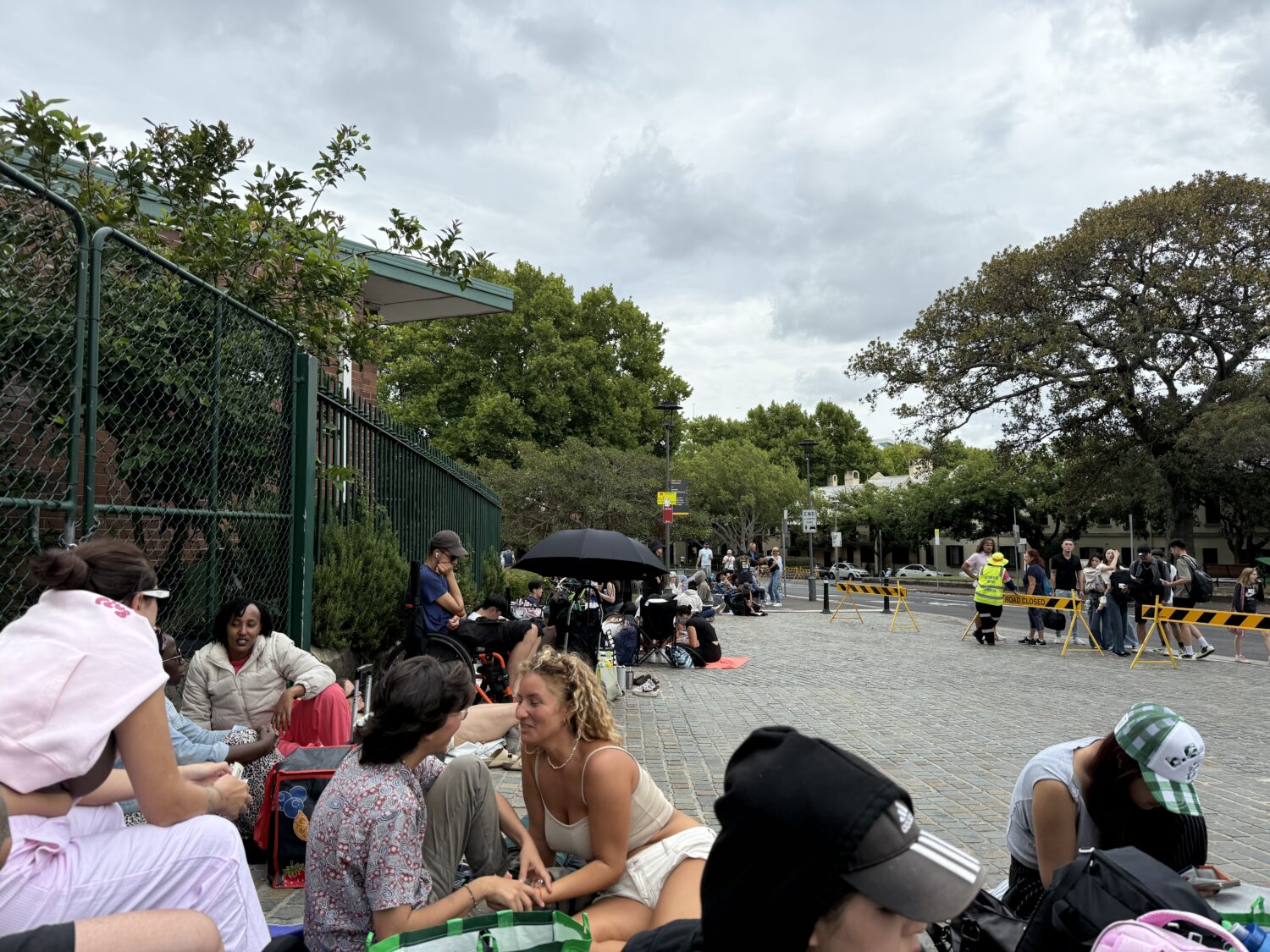 Men klokken 07:30 kom det noe annet. Vakter. Parken skulle tømmes for å gjøres «terror-sikker» og sperres helt av. Alternativet vårt var å gå tilbake til start og stille oss i en kø som så ut til å bli endeløs. Men vi var først – og dermed garantert tilbake til vår perfekte plass.