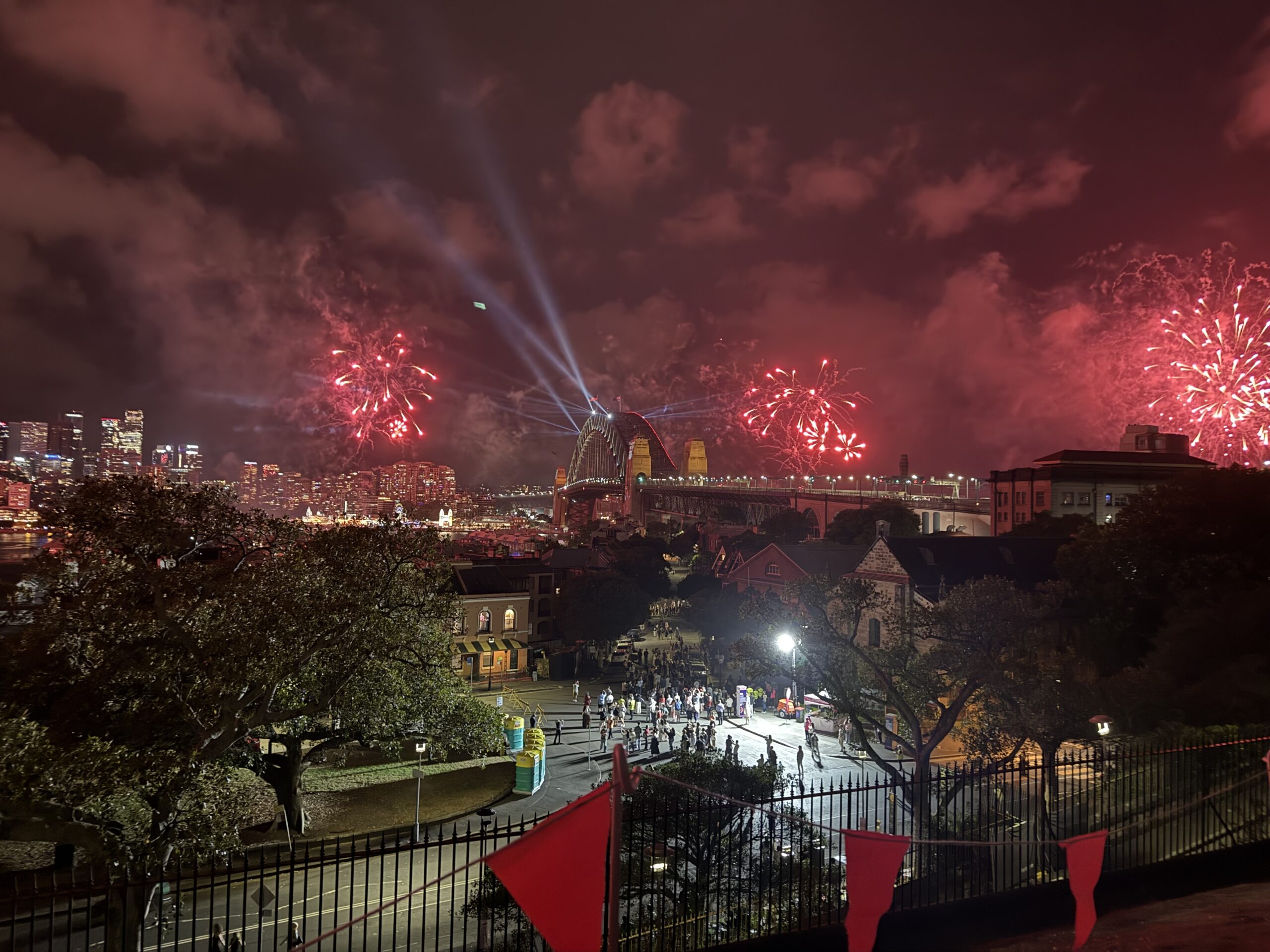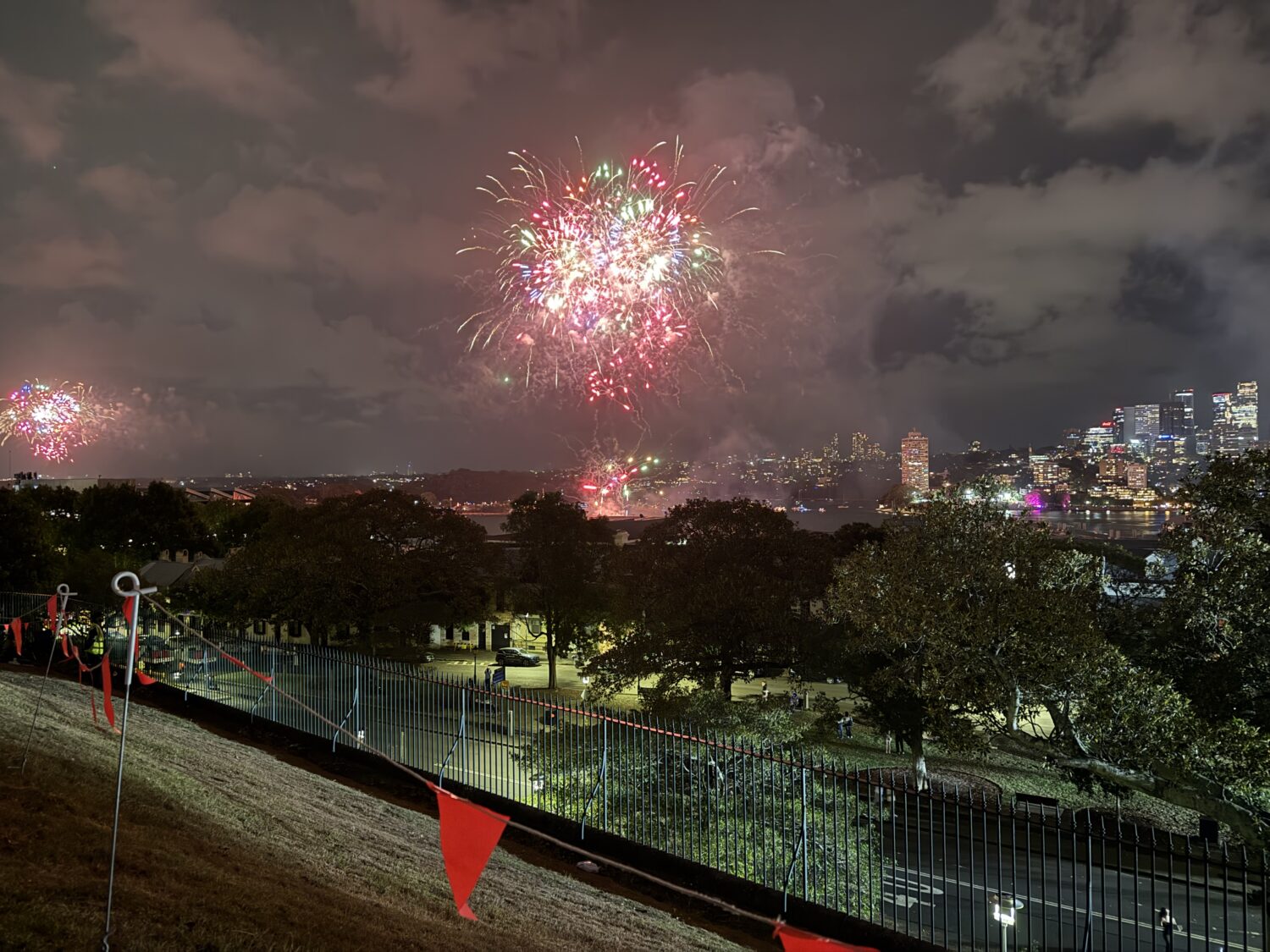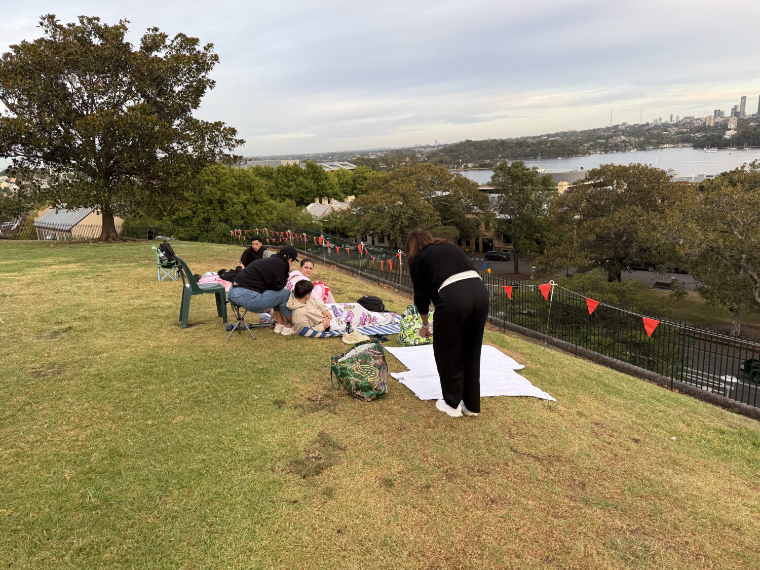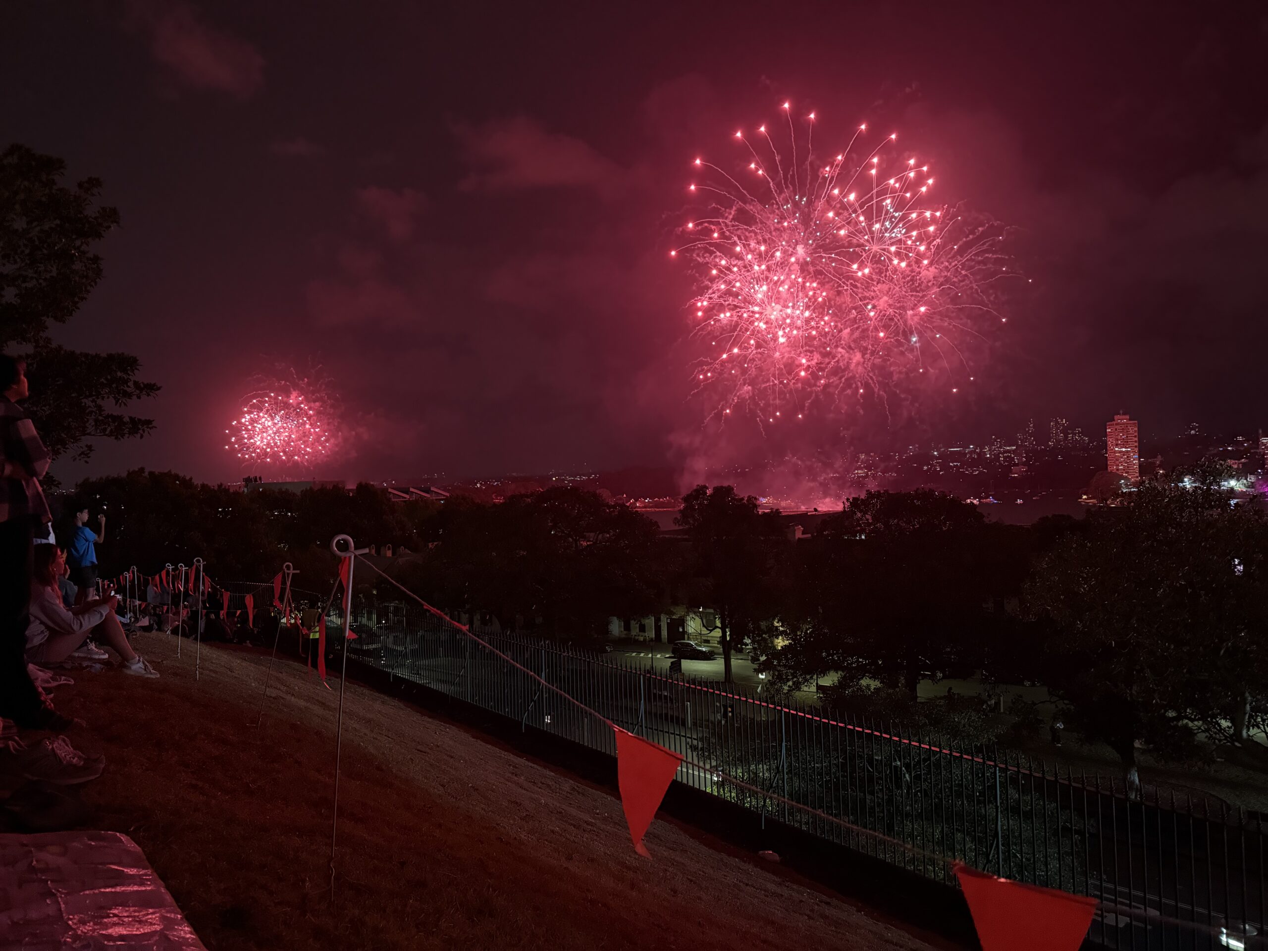 Vi pakket det vi måtte ha med oss og bestilte en Uber, som fraktet oss raskt til Observatory Park. Vi hadde sett for oss kaos og fullt hus, men der tok vi feil: det var knapt 15 mennesker der. Og vi? Vi kapret den perfekte plassen – helt fremme på plenen, med utsikt mot broen og halve byen. Der var det bare én ting å gjøre: kjede seg i 18 timer, så skulle fyrverkeriet komme.