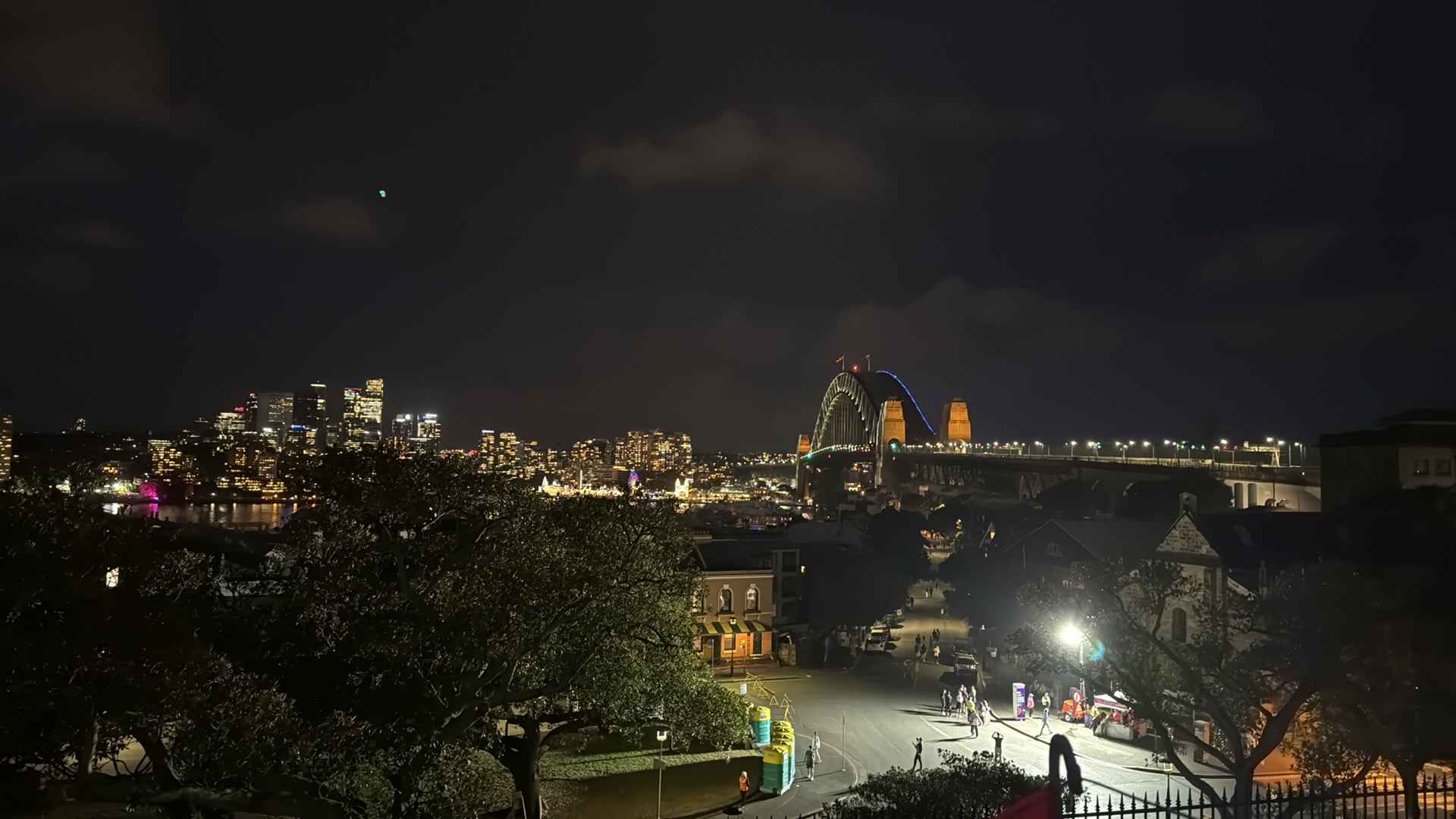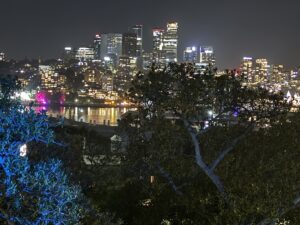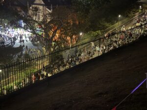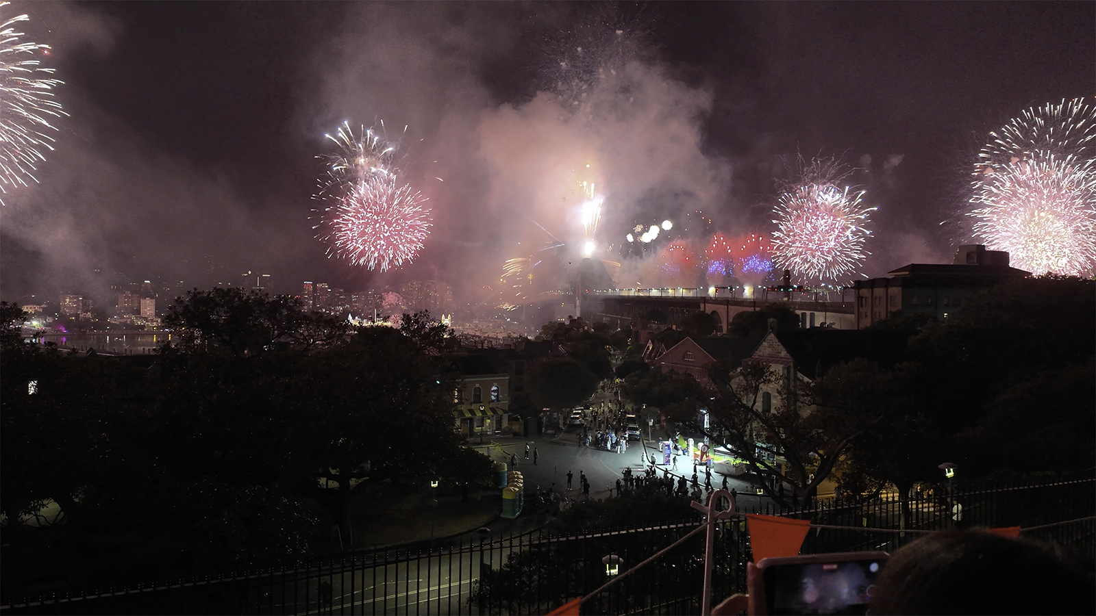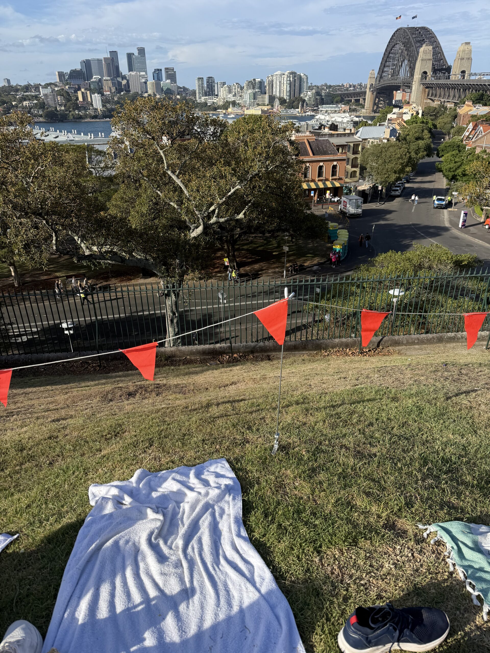Vi pakket det vi måtte ha med oss og bestilte en Uber, som fraktet oss raskt til Observatory Park. Vi hadde sett for oss kaos og fullt hus, men der tok vi feil: det var knapt 15 mennesker der. Og vi? Vi kapret den perfekte plassen – helt fremme på plenen, med utsikt mot broen og halve byen. Der var det bare én ting å gjøre: kjede seg i 18 timer, så skulle fyrverkeriet komme.