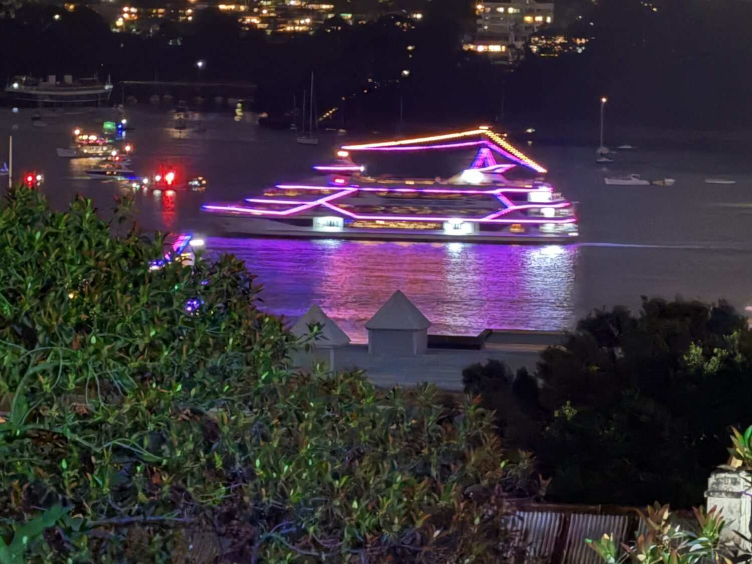 Da mørket falt på, dukket også flying bats opp. Ridende politi og SWAT-team marsjerte seks–sju i bredden med våpen foran seg. Samtidig gled titalls båter sakte forbi ute på vannet, pyntet med lys i alle farger – som papegøyer i formasjon. En hel kortesje, og alle båtene skiftet farge synkront. Dritkult.